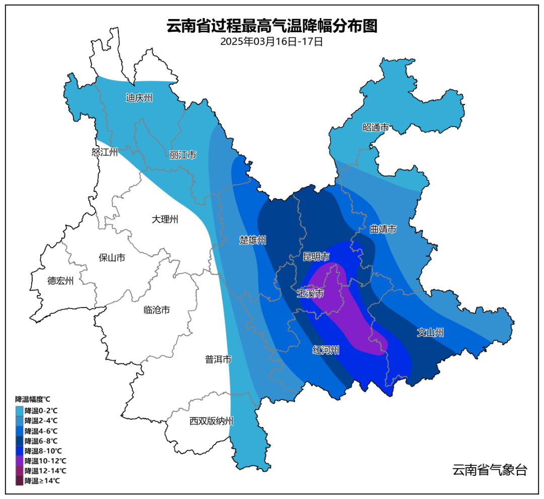 2.中東部、南部和麗江市東部最高氣温下降明顯,需防範強降温對低温敏感農經作物的不利影響;公眾需加強健康防護,注意用火用電用氣安全。
