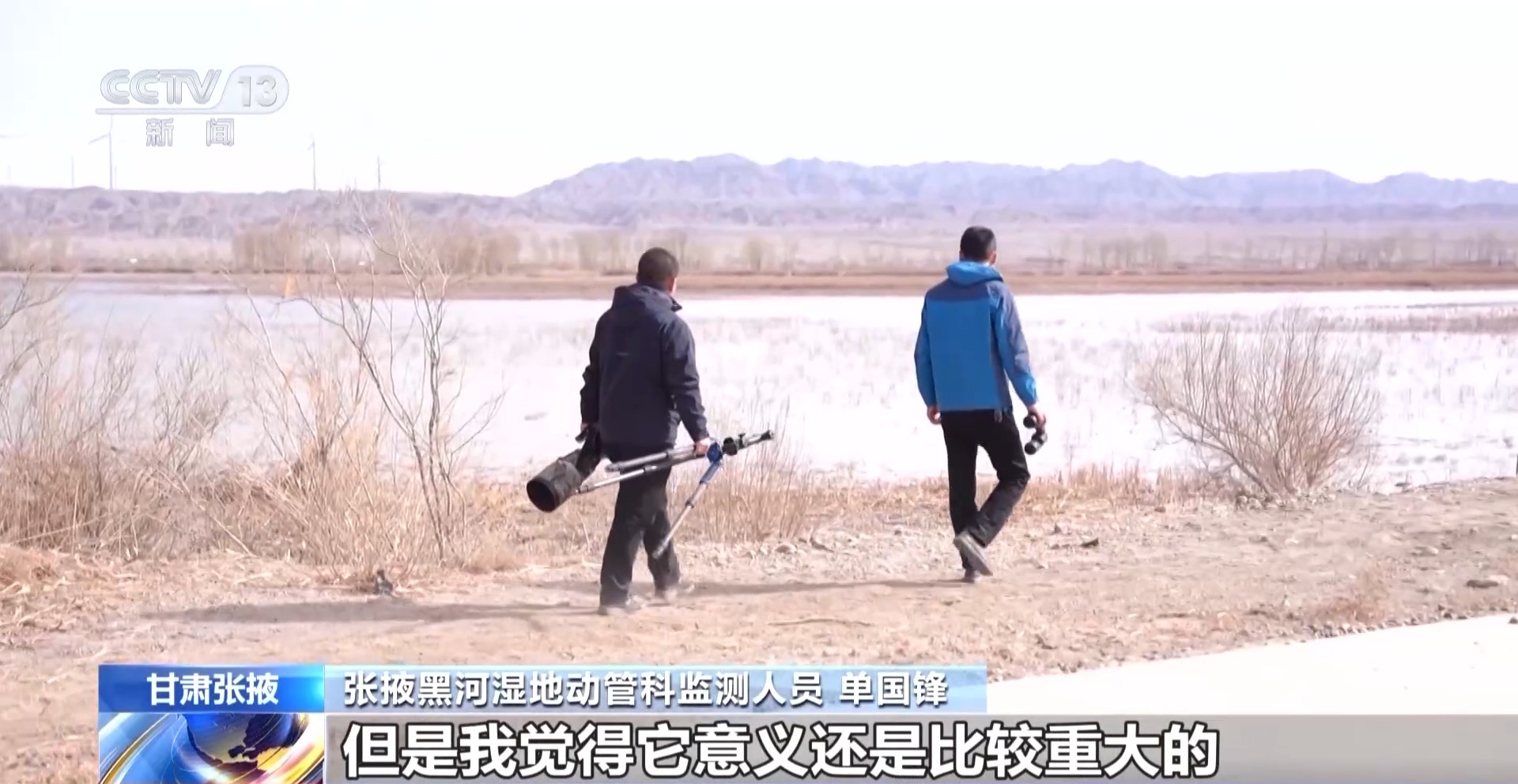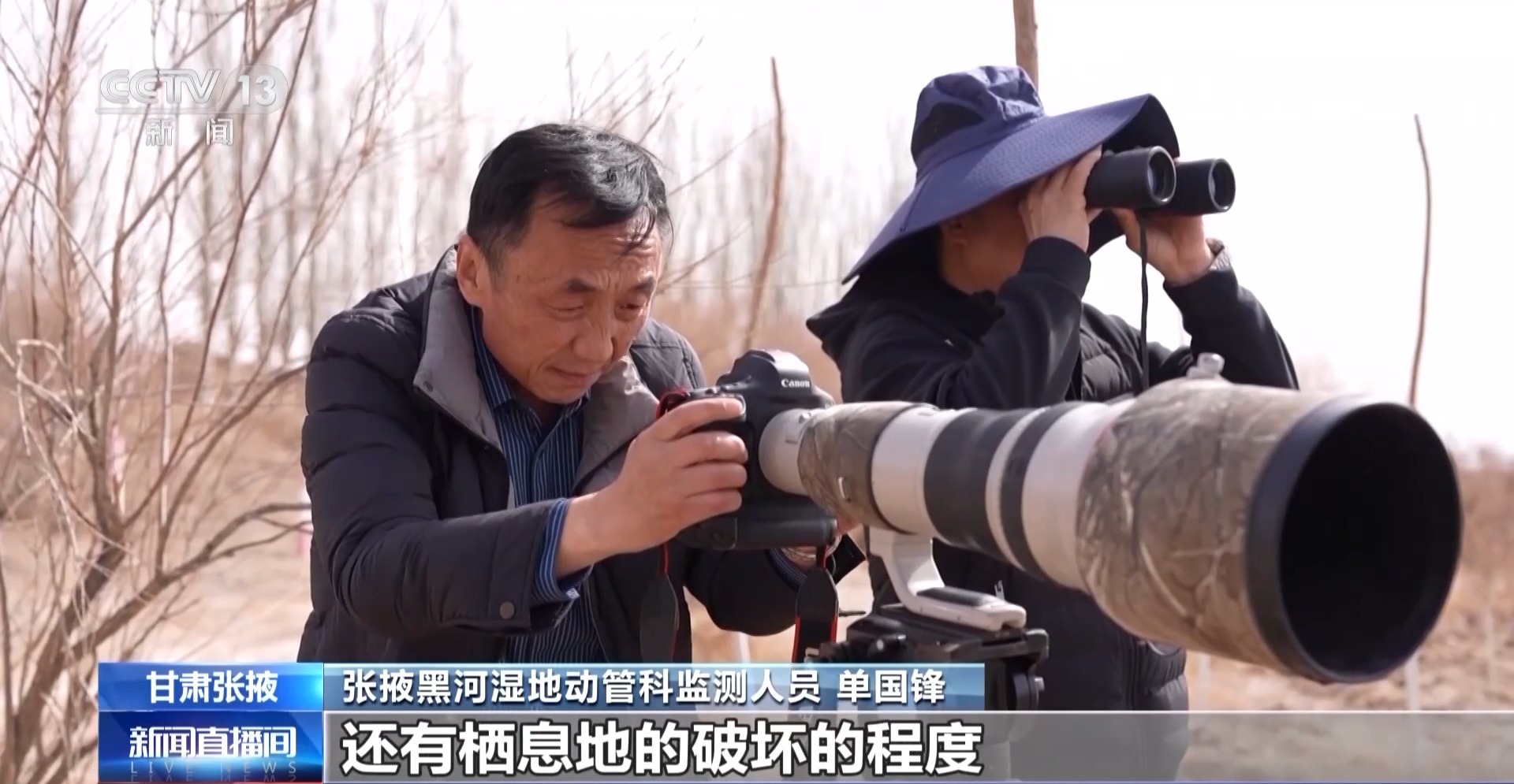 *張掖黑河濕地動管科監測人員 單國鋒:*主要是在現場觀察鳥類的種類、數量、成幼比例、性別比例,以及棲息地的破壞的程度和鳥類受干擾的程度。