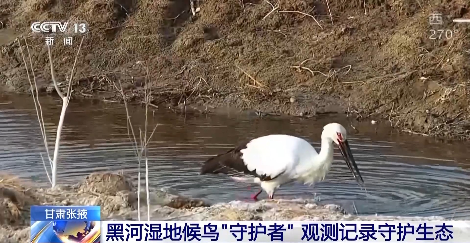 *張掖黑河濕地動管科監測人員 單國鋒:*我們通過這幾年的監測,發現黑鸛在五六月份時覓食比較困難,因為此時河道里的魚和水都比較少。因此我們營造這樣一個生境,在裏面投一定的魚食,在其他地方也將灌木或者喬木栽植起來,利用植被對它進行遮擋和隱蔽,這樣它的棲息地就完整了。
