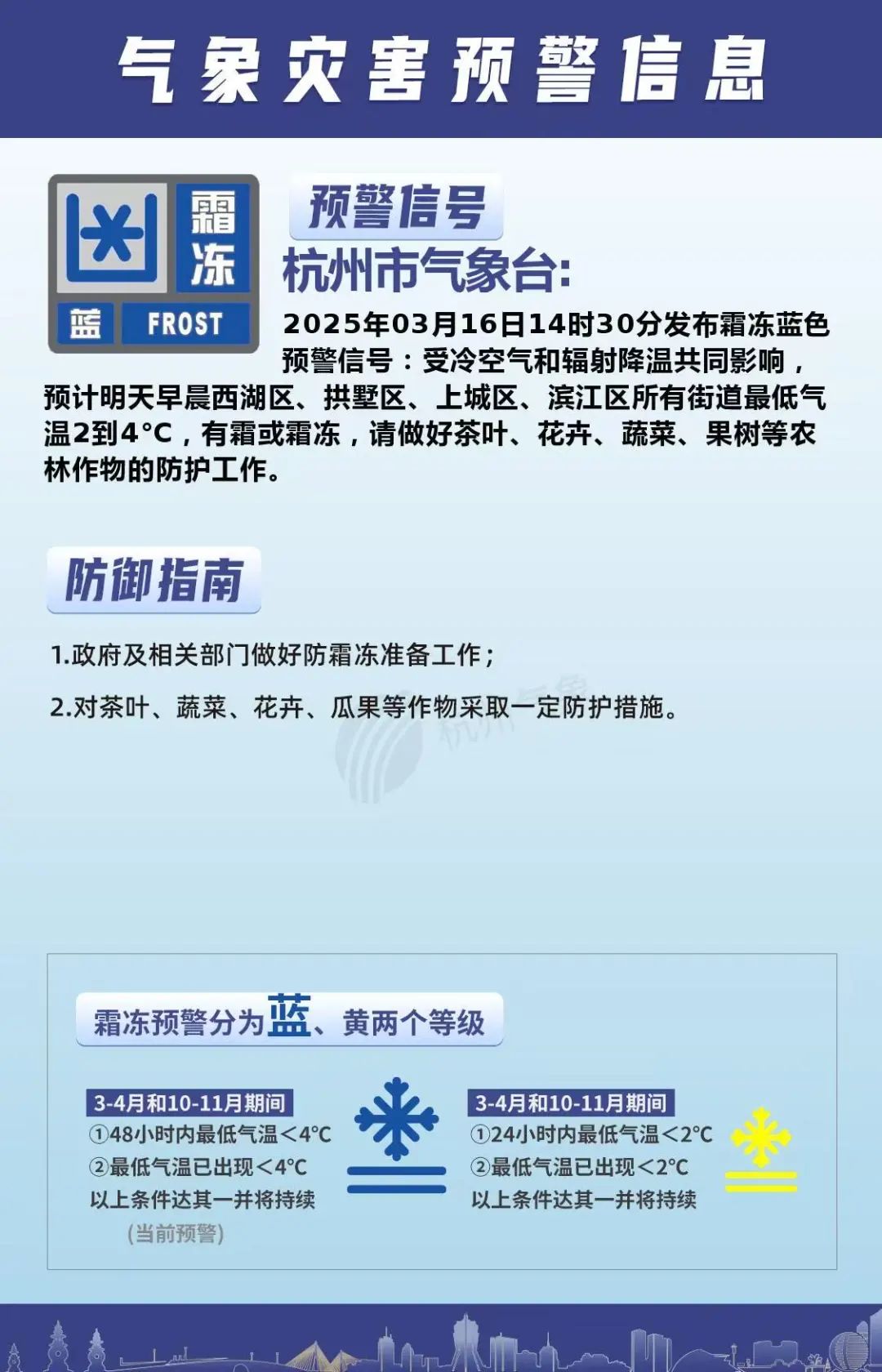剛剛,*杭州市氣象台發佈霜凍藍色預警信號:*受冷空氣和輻射降温共同影響,預計明天早晨西湖區、拱墅區、上城區、濱江區所有街道最低氣温2到4℃,有霜或霜凍,請做好茶葉、花卉、蔬菜、果樹等農林作物的防護工作。此前,杭州多地也發佈黃色大風預警,藍色霜凍預警。
