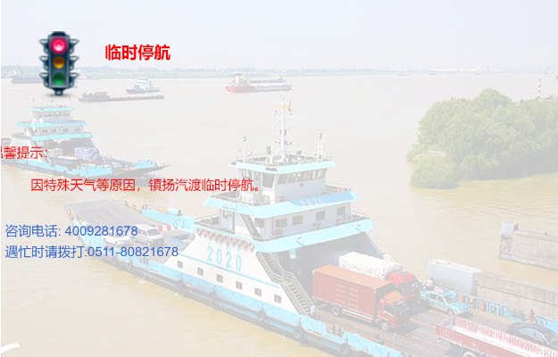 因特殊天氣等原因,鎮揚汽渡臨時停航 。另外,因江面風大,板橋汽渡、揚中-高港汽渡、七圩-圩塘汽渡、通沙汽渡、江陰-靖江汽渡、太海-海太汽渡臨時停航。