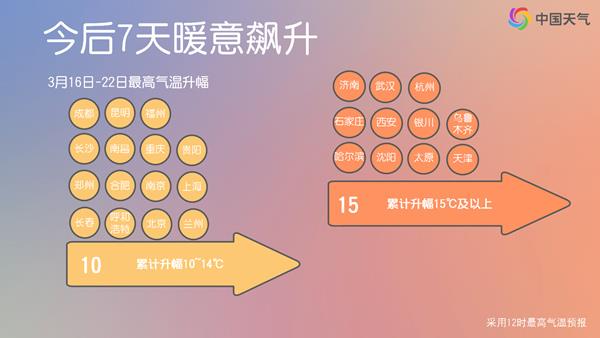 *下週二(3月18日)開始,中東部大部地區氣温將逐漸回升,*這次升温過程節奏快、幅度大、持續時間長,將是小步快跑式升温。