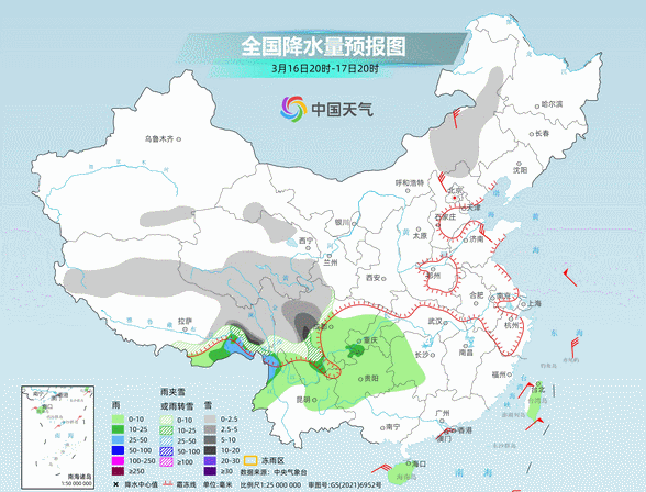 其中,今天(3月16日)夜間至18日,西藏東部、青海南部、川西高原、雲南北部等地有小到中雪或雨夾雪,局地有大雪,西藏東南部、雲南西北部有中到大雨。