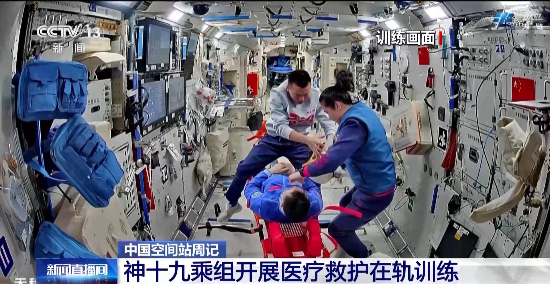 乘組按計劃開展了醫療救護在軌訓練,進一步熟悉設備位置、複習使用方法、鞏固操作流程和技能,並通過訓練感受天地差異,熟悉微重力環境下的救護操作方式、施力特性等。