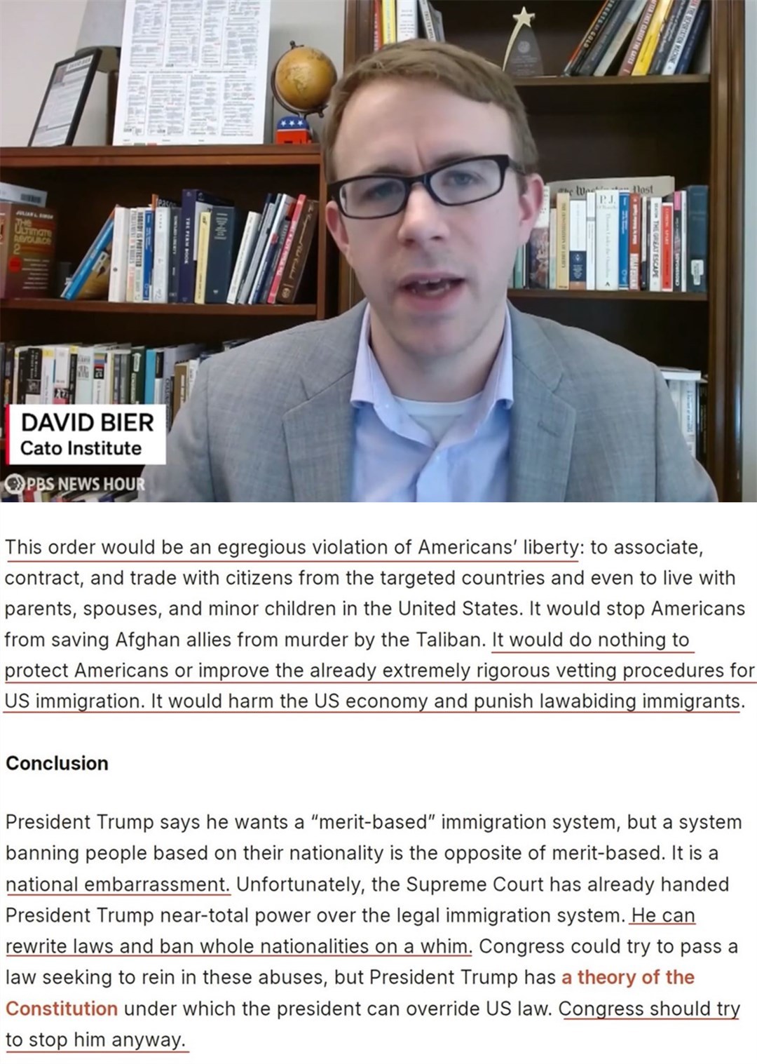 拜爾在報告最後總結説,特朗普稱他想要建立一個“基於能力”的移民系統,但他正在打造的這個基於國籍的簽證等級缺席與他所宣稱的恰恰相反。