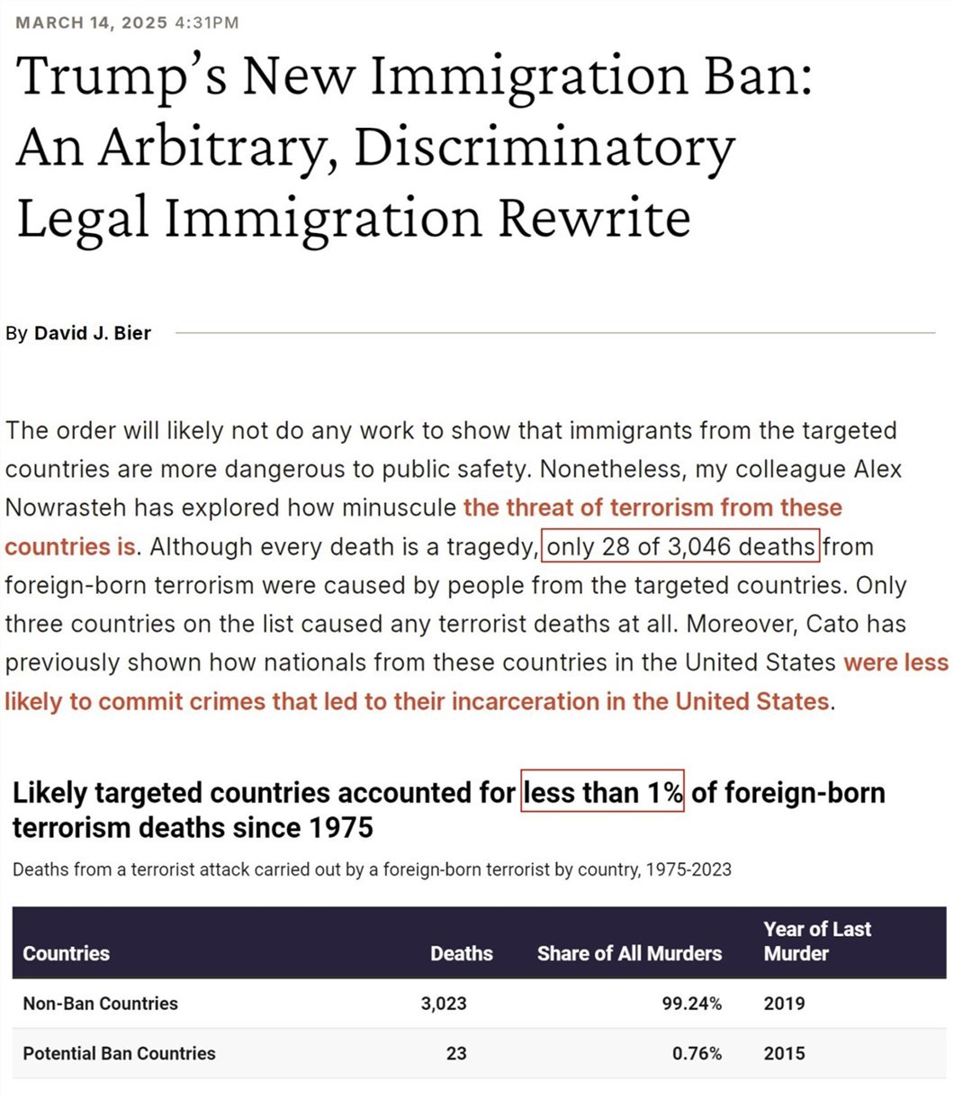 根據該報告,1975到2023年間,在3046名死於外國出生的恐怖分子之手的美國人中,只有28人的死亡是由來自特朗普計劃限制的“目標國家”的人所造成的,佔比不足1%。