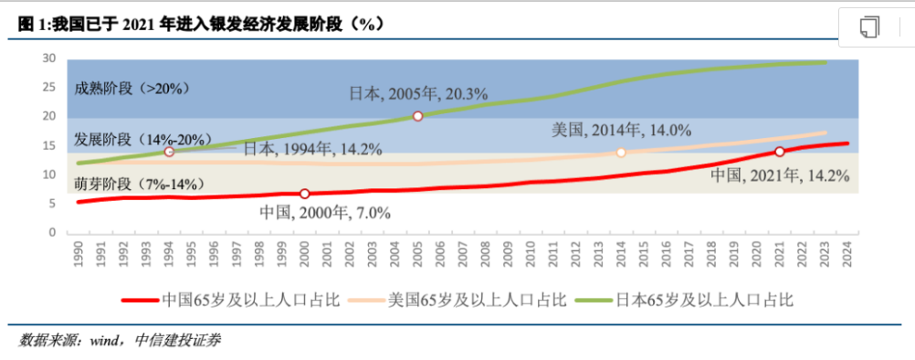 中信建投證券近日撰文指出,隨着全球人口老齡化進程加速,銀髮經濟作為新興經濟形態,逐漸成為推動各國經濟發展的新熱點。在我國,政府高度重視銀髮經濟,相繼出台一系列政策,為其發展提供了堅實的政策保障與方向指引。