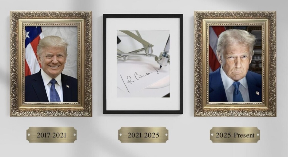 【環球網報道】據美國福克斯新聞網報道,美國總統特朗普16日在其社交平台發佈並置頂了一張圖片,圖中包含其第一任期官方肖像照、美國前總統拜登的自動簽名筆,以及特朗普第二任期官方肖像照。有網友評論稱,拜登的總統肖像照被自動簽名筆取代,福克斯新聞網則稱,特朗普此舉諷刺了拜登使用自動簽名筆的做法。