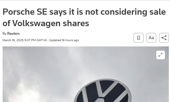 不過,保時捷控股在聲明中表示,公司目前及2024年期間均未具體考慮出售大眾股份事宜,任何出售計劃都需在其財報中披露。“我們亦未與投資者討論過出售大眾股份事宜。保時捷控股致力於作為大眾汽車集團的長期主要股東,並堅信其增值潛力。“對於此,大眾汽車方面拒絕發表評論。