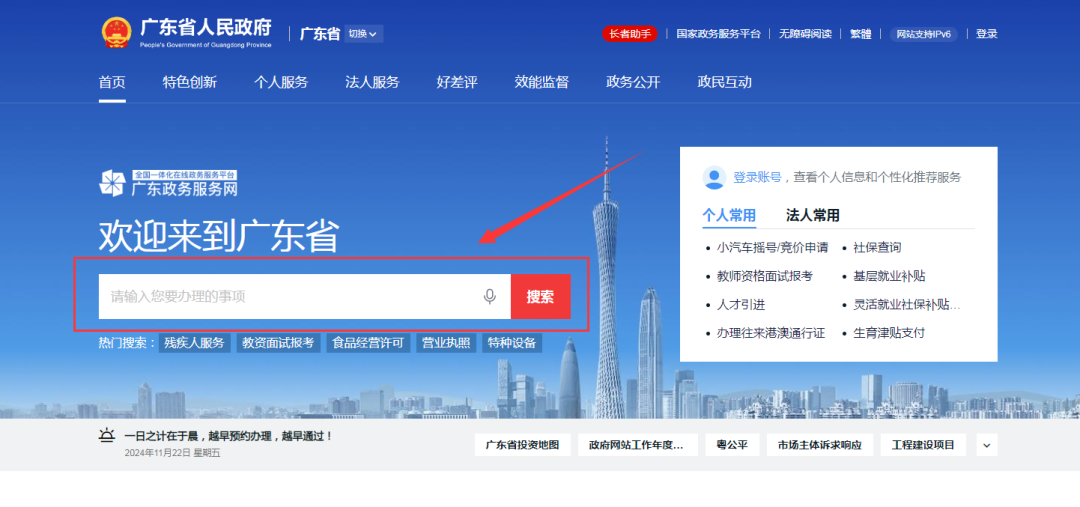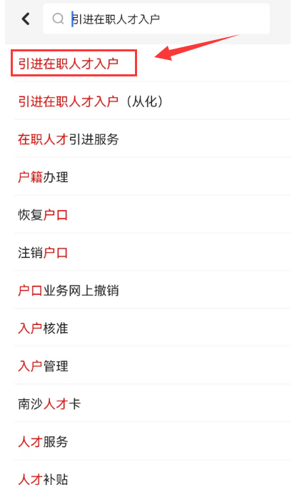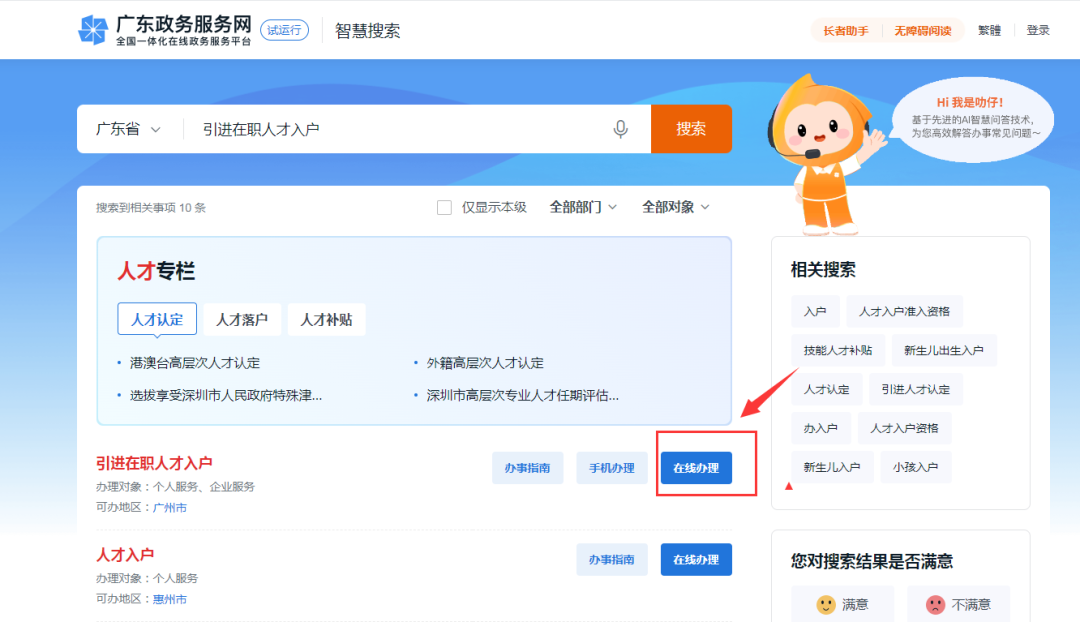 通過廣東政務服務網(網址:https://www.gdzwfw.gov.cn/portal/index),在搜索欄目中搜索*“引進在職人才入户”事項*,在搜索結果頁面點擊“在線辦理”,選擇“廣州市”及對應的需辦理入户的市本級/區,再次點擊“在線辦理”,登錄後即可進入系統辦理業務。