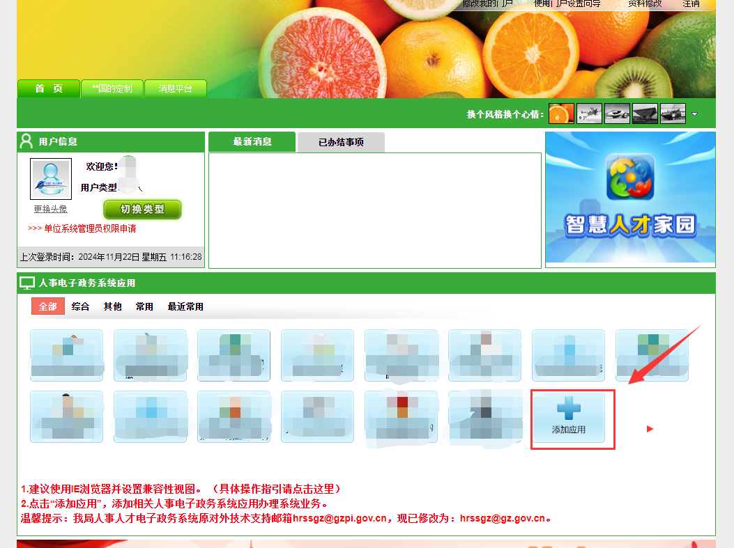 通過廣州市智慧人才家園(網址:https://gzrsj.rsj.gz.gov.cn/vsgzhr/login_home.aspx),登錄後,如未申請過系統權限,需先點擊“添加應用”,添加“人才引進申辦系統”,申請成功後,即可登錄系統辦理業務。