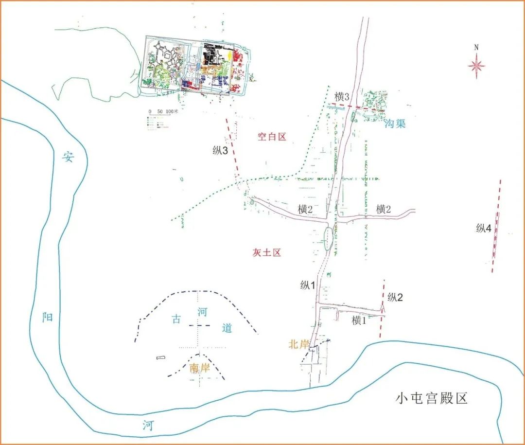 2024年度,中國社會科學院考古研究所在洹河北岸地區鑽探發現多條古代道路的路溝和溝渠,路溝多條,有橫向、縱向兩種,分寬、中兩級,最寬一級寬度超過15米,最寬處近30米。溝渠一條,寬6、深3、長100餘米,初現商代晚期大邑商都城的三橫三縱骨幹道路網絡格局。