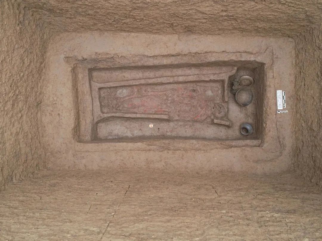 墓地可分為三區。第一區位於墓地西南,包括3座甲字形墓,盜擾嚴重,墓道朝南,墓主頭向北。其中,M26規模最大,建造方法為先挖南北長8.7、東西寬6.6米的墓坑,坑內底部鋪墊2~5釐米厚的木炭,然後夯築墓基,再在墓基上開挖“亞”字形墓室,並構築“亞”字形槨室。第二區位於墓地西北部,包括4座土坑豎穴墓,墓主頭向東,墓葬隨葬品較少。第三區位於墓地中東部,包括25座土坑豎穴墓,又可細分為若干組,墓主頭向南,俯身直肢,保存相對較好的人骨經鑑定均為男性,均隨葬銅器、玉器、陶器等。
