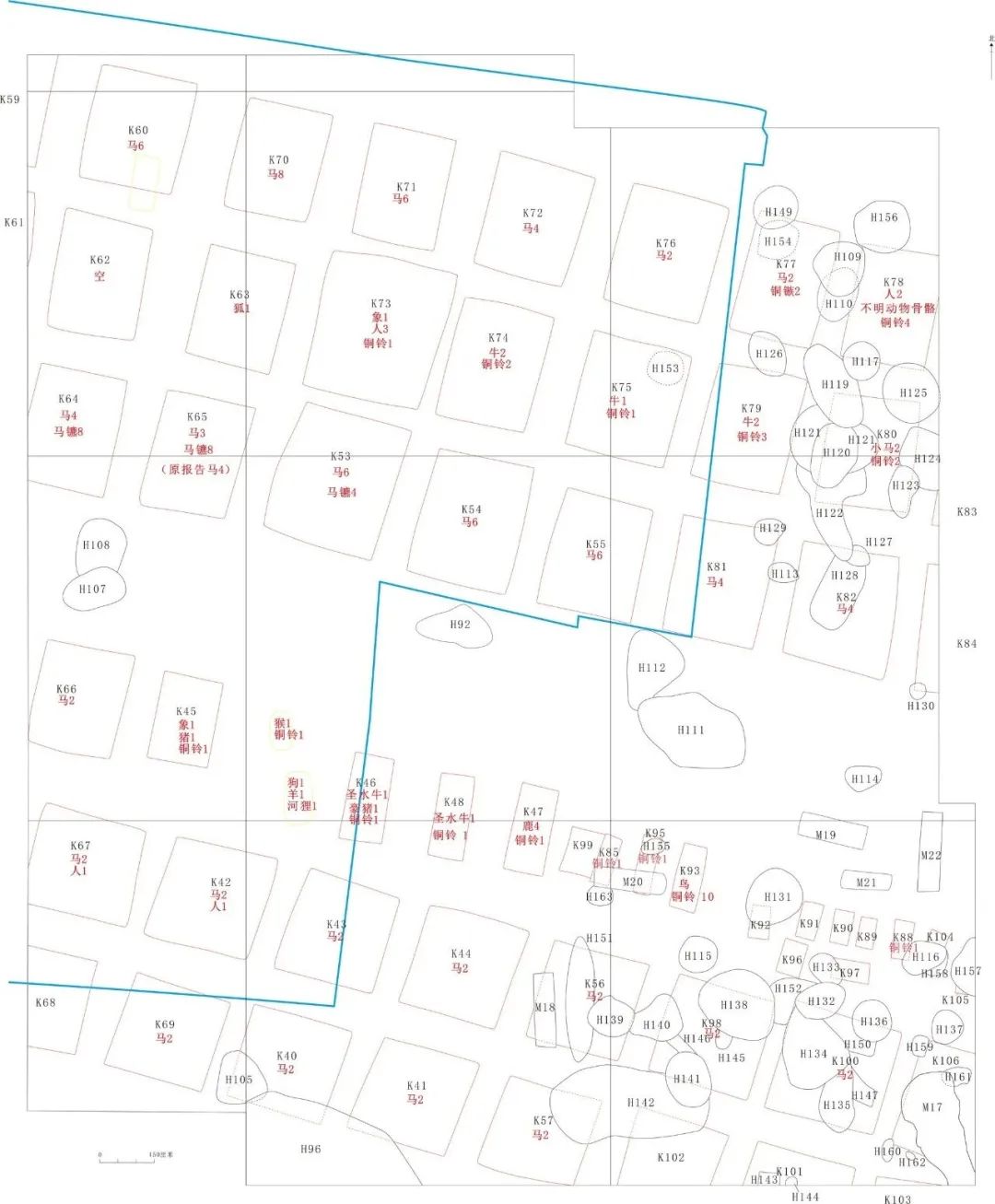 在西北岡商王陵區西圍溝東側探方內發現58座商代祭祀坑,發掘48座,可分為大、中、小三類,均為長方形。以大型祭祀坑最多,發掘確認有6排。由新發掘大型祭祀坑的填埋特點推測,祭祀坑內存在多次祭祀。祭祀坑內動物骨骼種類豐富,包括馬、牛、象、鳥等,還有特殊組合坑。此外,在該發掘點還發現西周灰坑、墓葬。