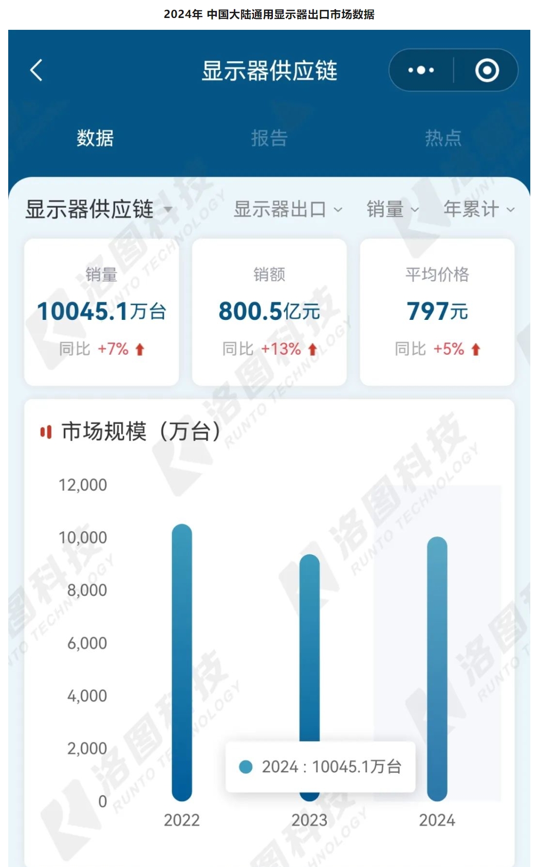 【環球網科技綜合報道】3月17日消息,洛圖科技(RUNTO)發佈的數據顯示,2024年全年,中國大陸通用顯示器(不含車載和航空等)的總出口量約為1.0億台,同比增長7.2%;出口額為800.5億元,同比增長12.9%;按美元計,出口額為112.5億美元,同比增長11.7%。