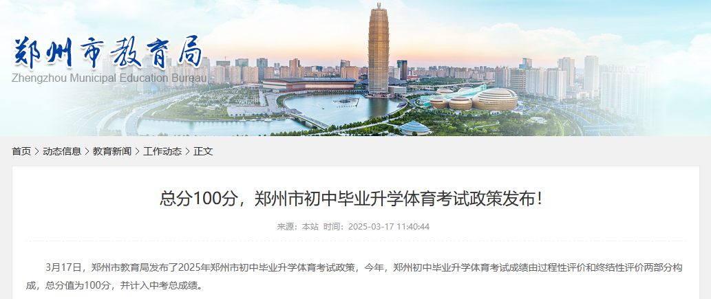 3月17日,鄭州市教育局發佈了2025年鄭州市初中畢業升學體育考試政策:成績由過程性評價和終結性評價兩部分構成,*總分值為100分,計入中考總成績;*考試在5月30日之前進行完畢,市內十區考試時間從4月16日開始。