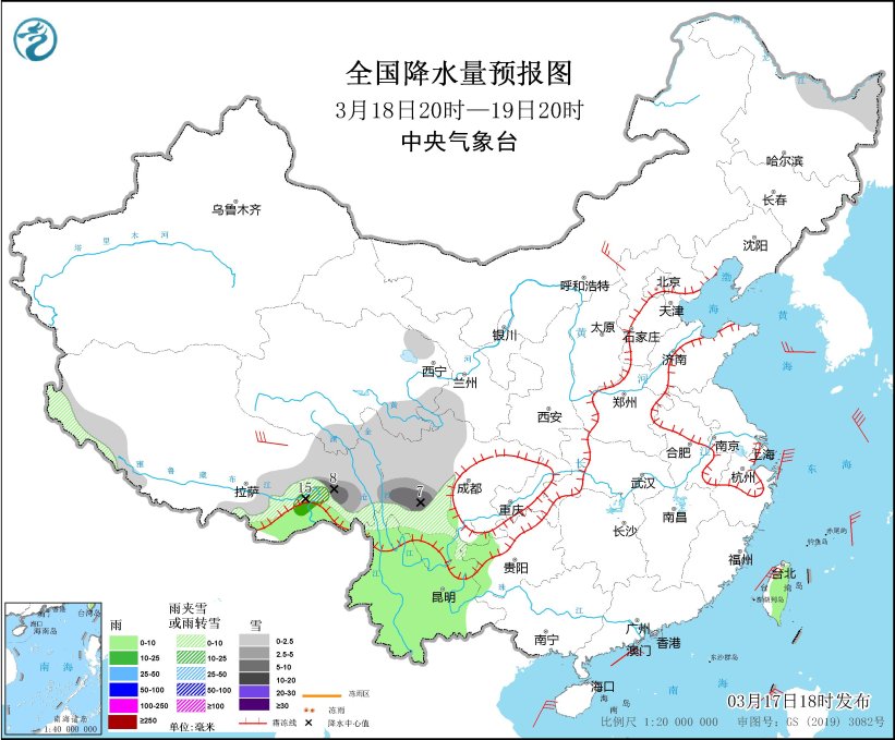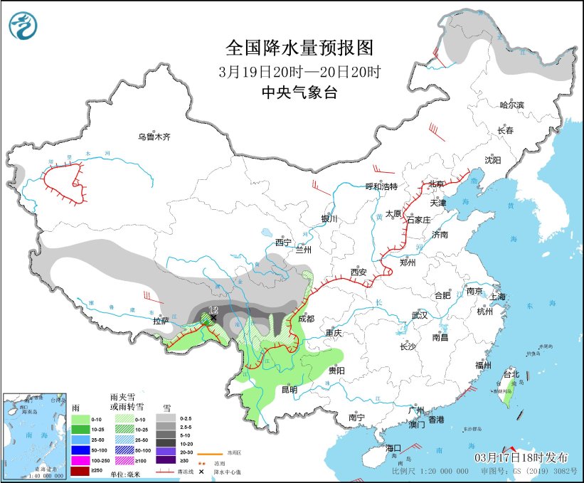 3月17日夜間至23日,西藏東部、青海南部、川西高原、雲南北部等地有小到中雪或雨夾雪,局地有大到暴雪;西藏東南部、四川盆地、貴州、雲南中南部等地有小到中雨,局地有大雨。