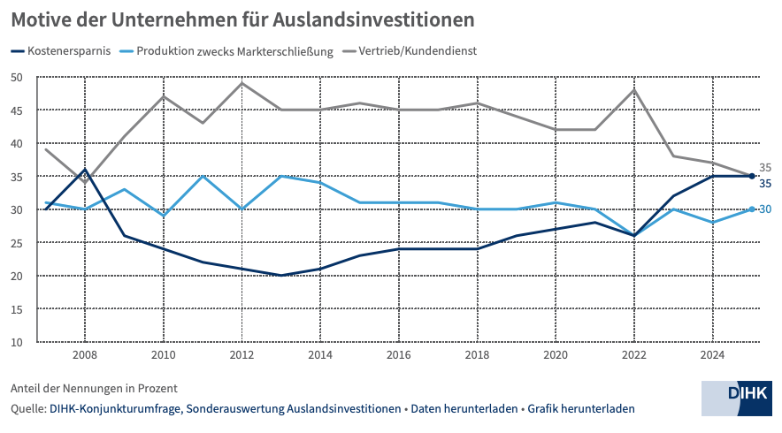數據顯示,35%的企業選擇海外投資的主要原因是成本削減,這一比例創下自2008年金融危機以來的新高。傳統上,德國企業進行海外投資的主要動機是市場拓展,而目前,這一因素的佔比已降至30%,僅與長期平均水平持平。