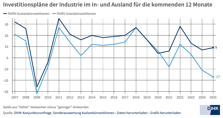 報告指出,在德國國內,工業企業的投資意願持續走弱。兩成企業計劃減少國內投資,顯示出德國在全球投資環境競爭中的劣勢正在擴大。對此,德國工商大會主席彼得·阿德里安表示:“企業需要更多的自由、更少的成本以及更高效的行政審批。德國如果不能迅速改善投資環境,將面臨競爭力下降的風險。”
