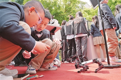 2024年5月13日,在哈爾濱工業大學學生創新創業成果展現場,小學生在體驗操作一款機器人。