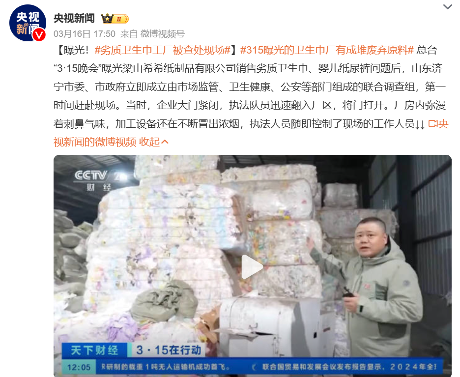 央廣網北京3月18日消息(記者 鄭潔怡)今年的“3·15”晚會曝光了“劣質衞生巾”事件:多家知名母嬰品牌的衞生巾和嬰兒紙尿褲殘次料被翻新售賣。*面對“翻新衞生巾”,女性如何進行自查自救?若不慎患上了婦科炎症怎麼辦?*廣東省中醫院芳村醫院婦科主任向東方給出解答。