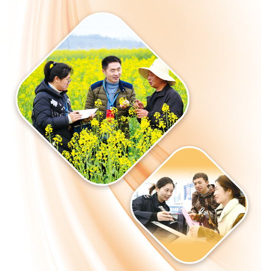 上圖:江西省上高縣錦江鎮團結村油菜花種植基地中,黨員幹部(左、中)正在瞭解春耕情況。