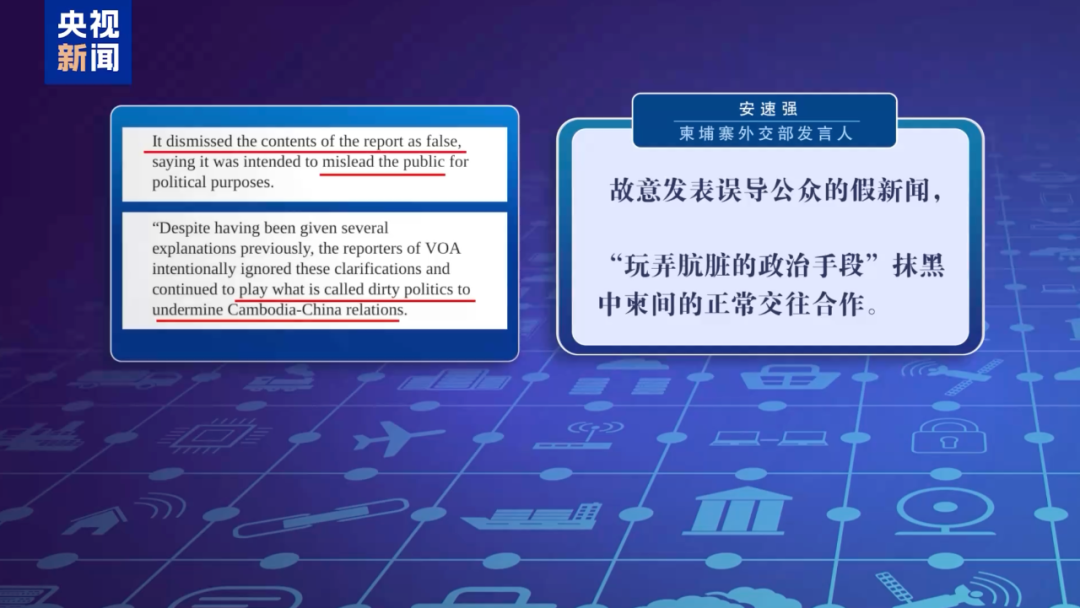 2023年2月,“美國之音”曾發表文章,惡意揣測柬埔寨首相洪森訪華目的,柬埔寨外交部發言人安速強怒斥“美國之音”故意發表誤導公眾的假新聞,“玩弄骯髒的政治手段”抹黑柬中間的正常交往合作。