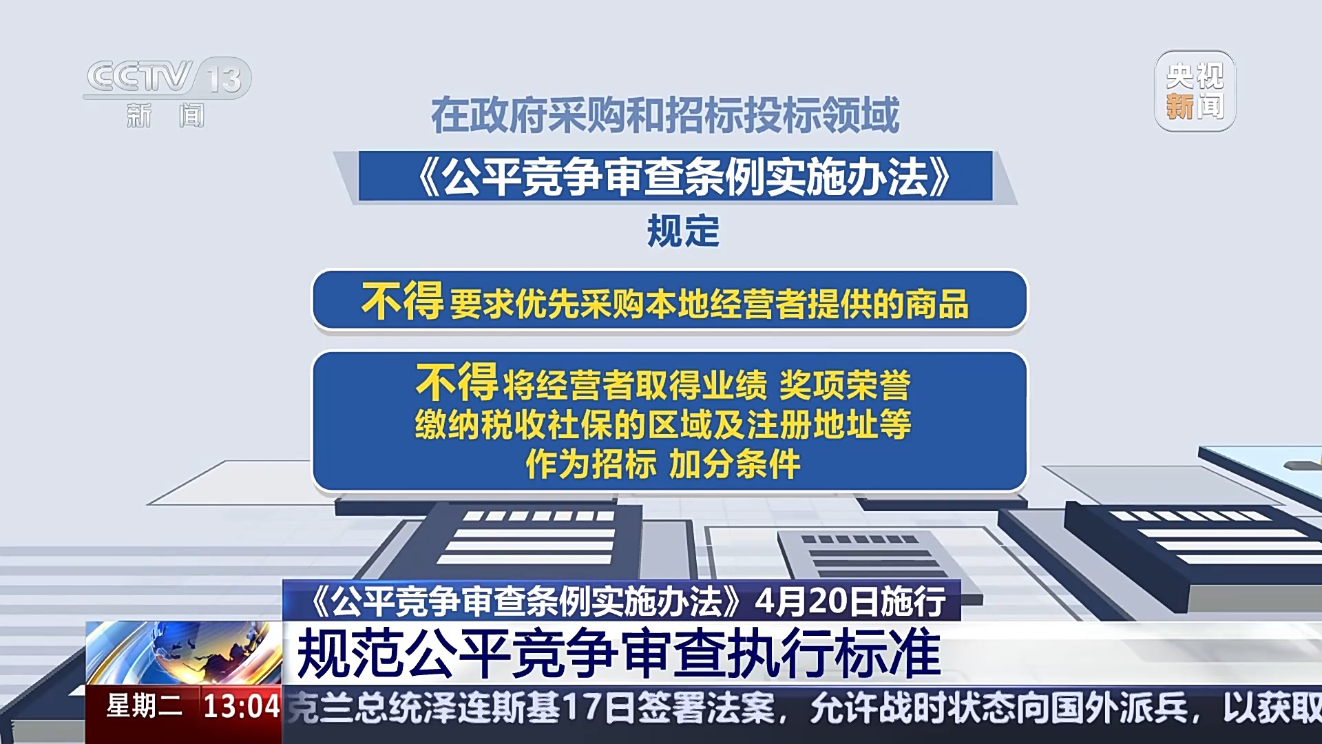 市場監管總局今天召開新聞發佈會,公佈《公平競爭審查條例實施辦法》,細化公平競爭審查標準。《實施辦法》將於4月20日正式施行。
