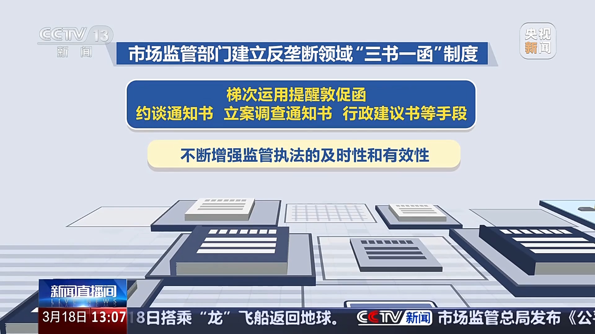 市場監管部門建立了反壟斷領域“三書一函”制度,梯次運用提醒敦促函、約談通知書、立案調查通知書、行政建議書等手段,不斷增強監管執法的及時性和有效性。