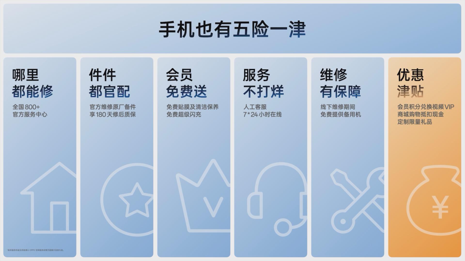 值得關注的是,OPPO A5 系列新品帶來了首個 “五險一津”服務,包括全國 800+ 直營服務中心、原廠配件 180 天質保、7X24 小時服務熱線等、線下門店享受免費會員服務、鑽卡用户三折屏碎保等保障服務。
