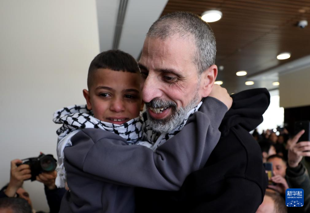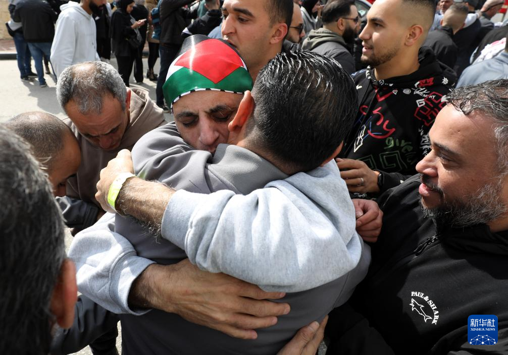 2月1日,在約旦河西岸城市拉姆安拉,人們擁抱獲釋的巴勒斯坦人。以色列當天釋放了183名被扣押人員。新華社發(艾曼·諾巴尼 攝)