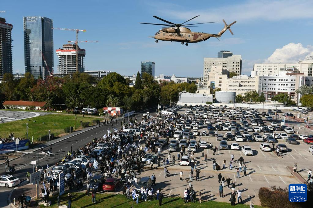 1月25日,搭載獲釋以色列被扣押人員的直升機抵達以色列佩塔提克瓦的一所醫院。新華社/基尼圖片社