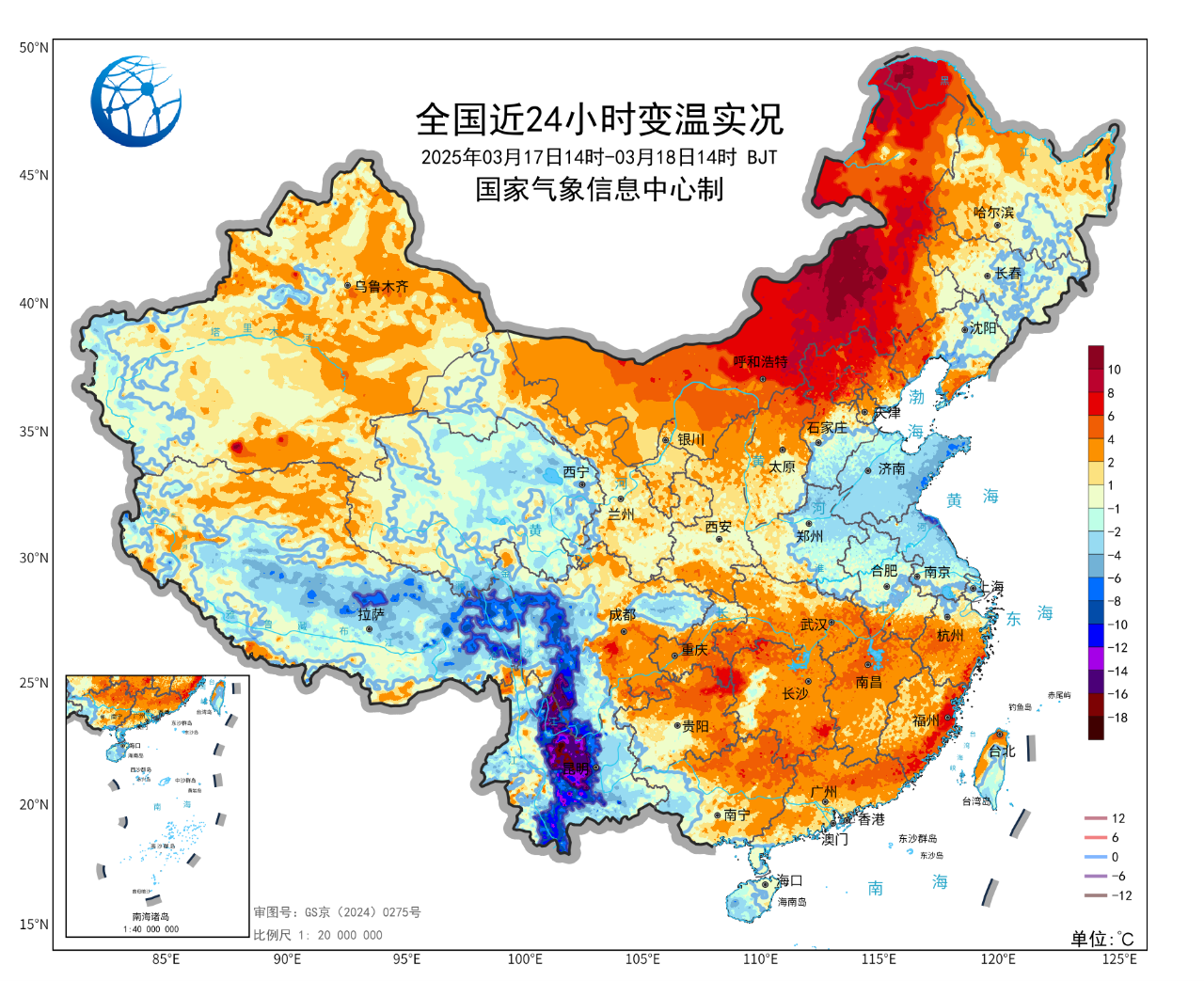 從變温實況圖上能夠看到,相比昨天同時次,今天14時中東部大部都以升温為主。但在雲南中部一帶,有一片十分突出的降温區域,那是由於近期冷空氣翻過烏蒙山,將準靜止鋒推到了雲南中部,導致雲南東部在冷空氣一側,氣温大幅偏低。