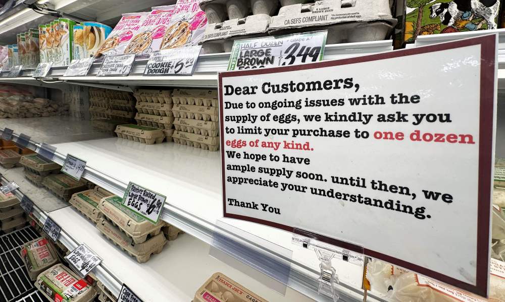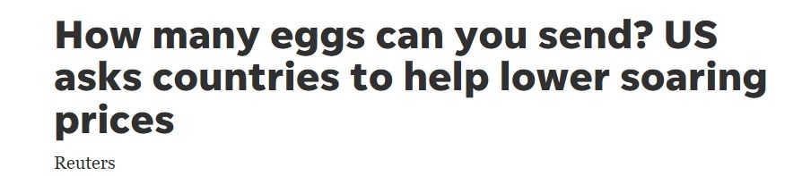 雞蛋讓美國總統特朗普傷腦筋。路透社説,特朗普先前承諾1月20日上任首日就要讓美國蛋價降下來,但執政滿一個月時,美國蛋價較去年同期上漲59%。