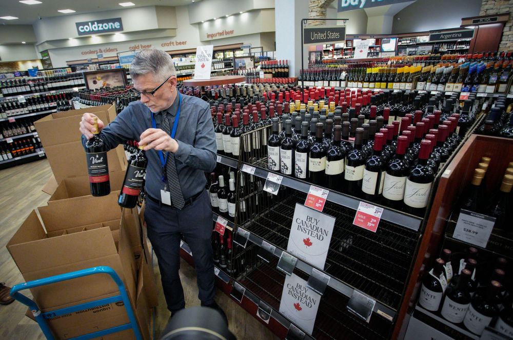 3月10日,在加拿大温哥華,一家不列顛哥倫比亞省酒類專賣店的店員從貨架上撤下美國酒類產品。新華社發(梁森攝)