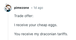 “這樣交易:我收你廉價雞蛋,你收我嚴厲關税。”