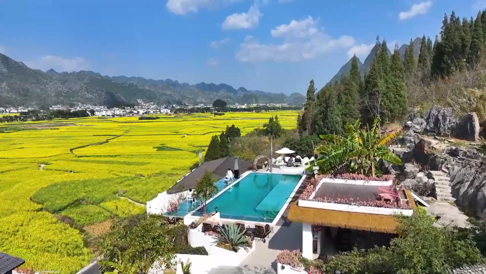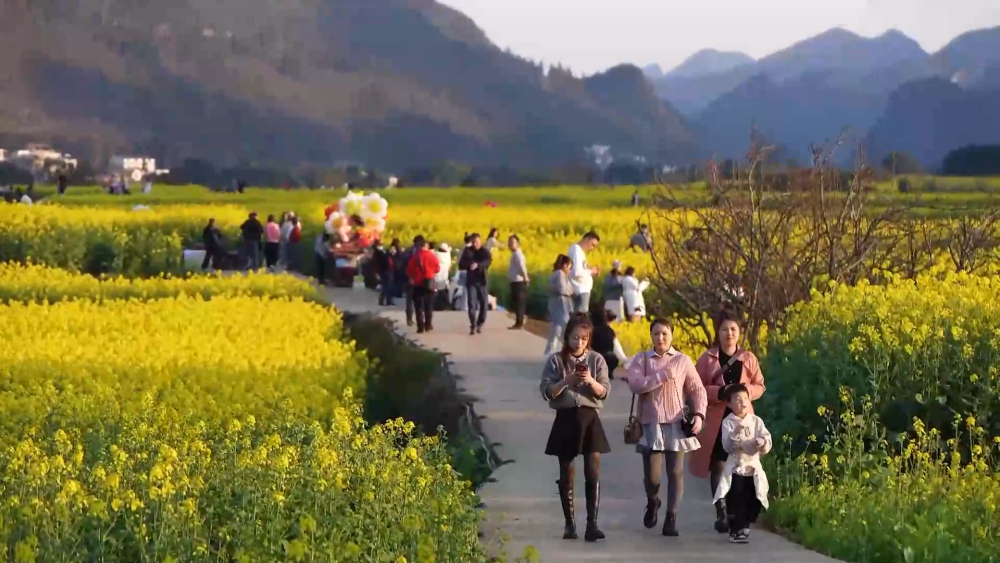 眼下,貴州省興義市萬峯林景區內的6000多畝油菜花競相綻放,盛開的油菜花與峯林、田園、村莊、河流交相輝映,金色花海染盡鄉野,形成一幅美麗的山水田園畫,吸引了眾多省內外遊客前來觀賞打卡,欣賞春日美景。
