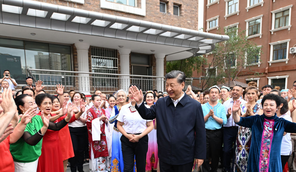 2022年7月13日上午,習近平在新疆烏魯木齊市天山區固原巷社區考察時,身着民族服裝的各族羣眾簇擁在總書記身邊,載歌載舞,向總書記表達由衷的愛戴。