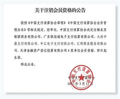 中國支付清算協會發布的公告顯示,按照《中國支付清算協會章程》《中國支付清算協會會員管理辦法》等相關規定,經審議,中國支付清算協會決定註銷北京銀聯商務有限公司、廣東銀結通電子支付結算有限公司、大連中鼎支付有限公司、中匯電子支付有限公司、匯明商務服務有限公司、天津金融資產登記結算有限公司6家單位會員資格,即日起生效。