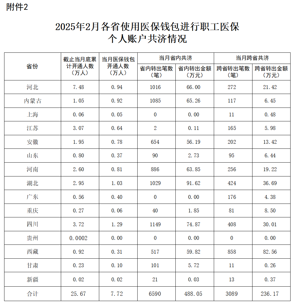 2025年2月,通過醫保錢包轉賬方式進行職工醫保個人賬户省內、跨省共濟共9679筆,轉賬金額724.22萬元。從共濟地域看,省內轉賬6590筆,轉賬金額488.05萬元;跨省轉賬3089筆,轉賬金額236.17萬元。從醫保錢包使用用途看,支付就醫購藥費用總計2916筆,金額53.67萬元;繳納居民醫保費用總計19筆,金額8506元。