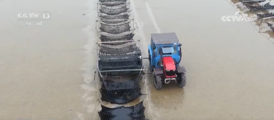 從空中俯瞰,在如東這片退潮後的灘塗上,一排排紫菜筏架,整齊有序。這幾天天氣晴好,工人們趁着退潮時機,搶收紫菜。