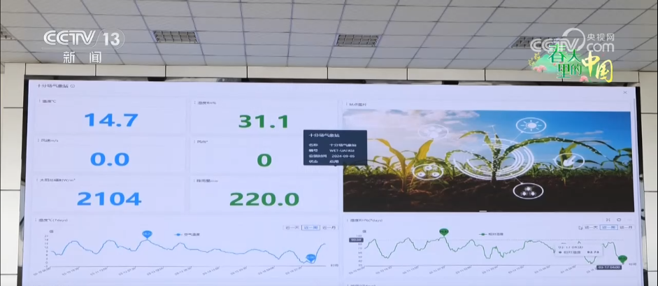 這樣操作得以實現,依託的是一張智能物聯網。這張物聯網鏈接了多台土壤分析儀、苗情監測儀、氣象監測站等智慧農業設備,將麥田裏的各種數據即時傳送到智能電子大屏上。農技專家通過即時數據,再結合田間巡檢無人機搭載的多光譜監測系統反饋的苗情狀態,以及農技人員田間實地調查情況,形成一套春季田管指導方案。比如,剛剛提到的修復凍傷小麥,就是通過監測系統捕捉到了缺肥發黃的田塊,才得以精準、高效地補施肥料。