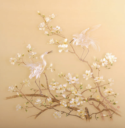 一米見方的畫布上,一對身姿優雅的白鷺輕盈地立在枝頭,像是在迎着和煦春風翩躚起舞;一朵朵千姿百態的玉蘭花競相綻放,彷彿有縷縷清香溢出,細微之處,生機勃勃、春意盎然。