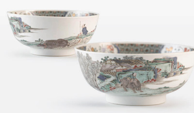不同角度的清康熙景德鎮窯五彩耕織圖碗。