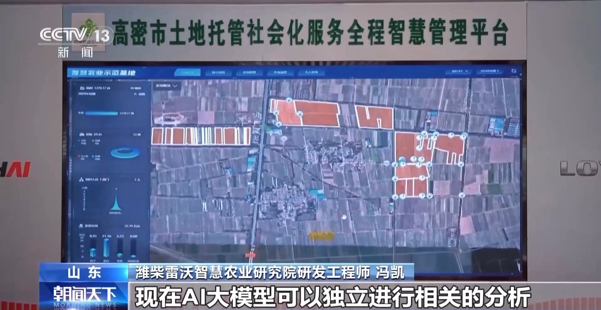 *濰柴雷沃智慧農業研究院研發工程師 馮凱:*1800畝地的智慧農場,我們安裝了17台墒情儀、2台氣象站,之前傳感器回傳的數據還需要人工在後台進行一次處理。現在AI大模型可以獨立進行相關的分析,將指令下發智能農機,就可以在不同的區域施用不同的施肥量,目前的施肥量可以節約10%。