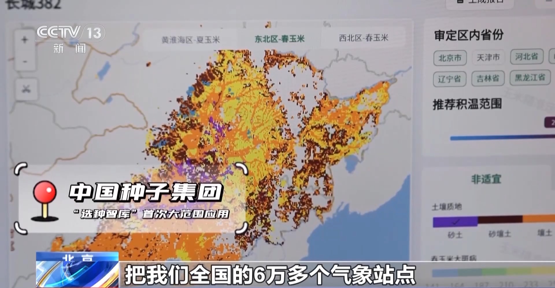*中國種子集團科技創新部負責人 宋維波:*把全國的6萬多個氣象站點以及土壤的一些信息,通過新的一些算法模型來精準預測到每一個品種最適宜的生長區域,精準度能到5×5公里,為每一個玉米品種精準繪製“適生地圖”,今年春耕我們向東北、黃淮海累計投放10個新品種。