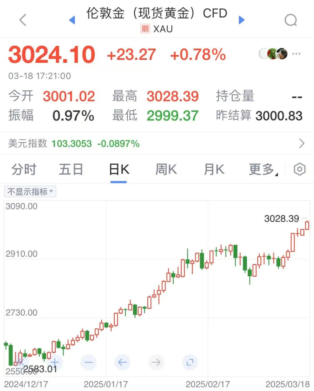 3月18日,COMEX黃金期貨突破3020美元/盎司,截至晚間報3026.2美元/盎司。與此同時,國內滬金期貨主力合約盤中突破700元/克,倫敦黃金現貨最高觸及3015.2美元/盎司,均刷新歷史紀錄。