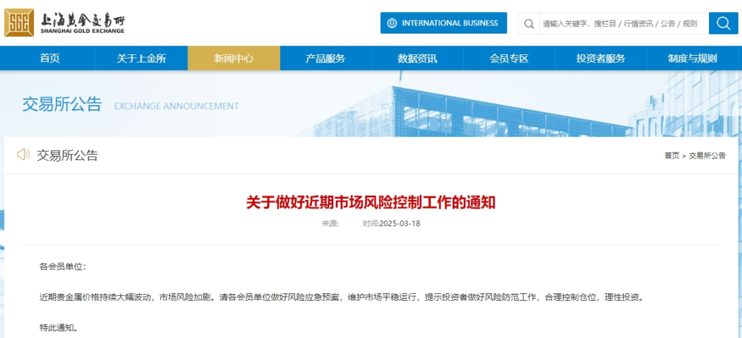 近日,國際金價屢創新高。3月18日,上海黃金交易所發佈《關於做好近期市場風險控制工作的通知》(以下簡稱《通知》)。