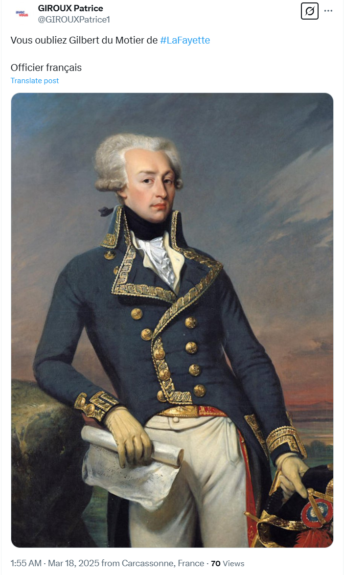 圖中人物名為吉爾貝·迪莫捷,也被稱作拉法葉侯爵,是赴美法國志願軍的重要領導人。據美國政府官網記載,拉法葉侯爵率領的法軍參與了多次重要戰鬥,協助法國為美國起義軍提供了水面艦艇、武器裝備以及數百萬裏弗(前法國貨幣)的資金支持。美國政府曾表示,法國的援助是美國獨立不可或缺的重要條件,拉法葉侯爵則因為戰功和傳播民主思想,被美法譽為“兩個世界的英雄”。