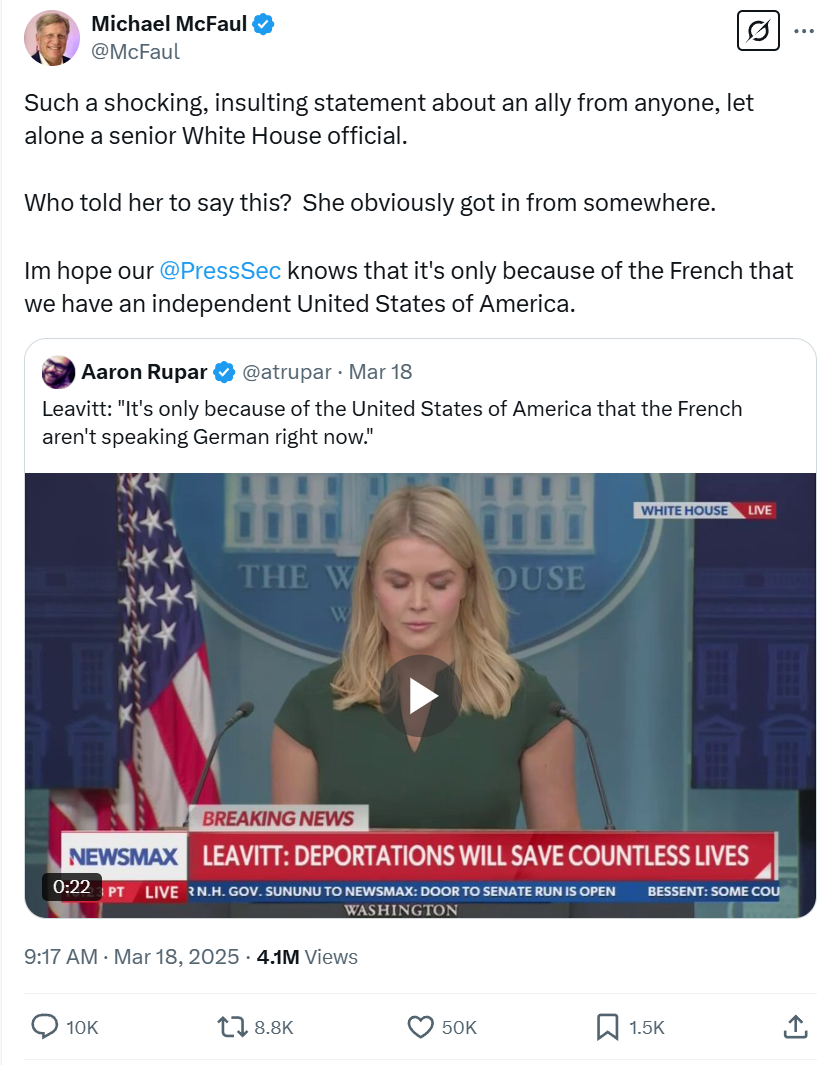 針對拉斐爾的表態,萊維特態度十分強硬,她援引法國在二戰爆發不久即被德軍佔領的“黑歷史”,再聯繫美國出兵參與歐洲反法西斯戰爭強硬回懟:“多虧了美利堅合眾國,法國人現在才沒有説德語。他們應該對我們偉大的國家感恩戴德。”